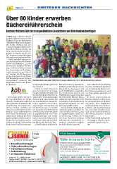 Seite 14 EMSTEKER NACHRICHTEN Über 80 Kinder erwerben Büchereiführerschein Emsteker Bücherei lädt ein zu ungewöhnlichen Leseaktionen und Bilderbuchnachmittagen Emstek (um) – Als sich in den ver- gangenen Wochen schon am Vor- mittag die Türen der Katholischen Öffentlichen Bücherei St. Margare- tha (KÖB) öffneten und eine Gruppe Kindergartenkinder in die gemütlichen Räume strömte, war nicht etwa eine Vorlesestunde an- gesagt: Die Steppkes wurden „bib- fit“ – sie machten ihren Bibliotheks- führerschein und das mit viel Elan. „Bibfit“ steht für Freude am Le- sen und das spielerische Kennen- lernen der Bibliothek. „Zu den Stichworten ,Erzählen und Wis- sen’, ,Vorlesen, Zuhören, Ausma- len’, ,Aussuchen und Ausleihen’ sowie ,Was gibt es, wo finde ich es?’ werden die Kindergarten- gruppen altersgerecht an Inhalte und Benutzung unserer Bücherei herangeführt“, erläuterte Ulla Kennen sich aus in der KÖB: Stolz zeigen die Kinder ihren Bibliotheksführerschein. Moormann, Leiterin der Emste- ker Bücherei. len Franziskus-Kindergartens für beit auch in unserer Ausleihe be- Zum Bilderbuch-Nachmittag ihren Einsatz. merkbar“, meint Ulla Moormann. an jedem 1. Mittwoch im Monat Dass die Emsteker Bücherei ein Man habe im vergangenen Jahr um 15 Uhr sind alle Kinder von 5 ganz besonderer Ort der Begeg- rund 25.000 Medien ausgeliehen, bis 8 Jahren eingeladen. Es wird nung ist, wird deutlich, wenn man das sei bei einem Bestand von mit ihnen gelesen, gebastelt und sich die Statistik des Jahr 2013 an- 10.000 Medien ein gutes Ergebnis gemalt. Seit einigen Jahren lernen so schaut. Über 90 Veranstaltungen für die Emsteker Bücherei. Um at- In diesem Sommer plant die die Vorschulkinder der beiden für Groß und Klein wurden von traktiv zu bleiben seien über 1000 Emsteker Bücherei online zu ge- Emsteker Kindergärten während den ehrenamtlichen Mitarbeite- neue Büche von Bestsellern bis zu hen und wird dann die Möglich- mehrer Stunden die Emsteker Bü- rinnen angeboten. Bei Vorlese- Literaturpreisträgern zur Aus- keit haben, ihren Mitgliedern cherei kennen. „Es ist immer wie- nachmittagen, Lesenächten und leihe angeschafft worden. auch die Ausleihe von e-books an- der faszinierend zu erleben, wie Büchereiführungen für Schüler Auch in diesem Jahr lädt das Bü- zubieten. „Ich bin sehr gespannt, intensiv sich die Kinder mit dem der Emsteker Grundschule bzw. chereiteam wieder zu etlichen Ak- wie sich dieses Angebot entwi- Medium Buch auseinanderset- der HRS, bei Aktionen wie „Lesen tionen einlädt: Die Aktion „Lesen ckelt und ob unsere Besucher da- zen", findet Ulla Moormann und an ungewöhnlichen Orten“ oder an ungewöhnlichen Orten“ star- von Gebrauch machen“, so Ulla bedankt sich während der Über- Buchausstellungen und -vorstel- tet am Sonntag, 30. März, um 18 Moormann. gabe des „Büchereiführerscheins“ lungen weisen die Mitabeiterin- Uhr in der Pfarrkirche St. Marga- n Alle Termine sind auch auf der ebenso bei den Kindern und Er- nen immer wieder auf die vielsei- retha mit einer musikalische Le- Homepage der Bücherei unter ziehern des Kath. Kindergarten tige Arbeit „ihre Bücherei“ hin. sung von „Israelische Geschich- www.koeb-emstek.de zu fin- Maria Goretti und des kommuna- „Sicherlich macht sich diese Ar- ten und jüdische Legenden“. den. • Brandmeldeanlagen • Einbruchmeldeanlagen • Videoüberwachung • Aufschaltung • 24-Stunden-Notdienst Lange Str. 25 · 49685 Emstek Telefon (04473) 947700 · Fax (04473) 947702 info@siemer-elektro.de · www.siemer-elektro.de