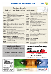 EMSTEKER NACHRICHTEN Seite 19 Gottesdienste, Beicht- und Bußzeiten zu Ostern Donnerstag, 27. März Westeremstek und Wohngebiete südl. der Clemens-Au- 10.00 Uhr Krankensalbungsgottesdienst in der Marienkapelle für gust-Straße und der Langen Straße. die Bewohner des Seniorenheims 22.00 Uhr für die Gläubigen aus Halen, Hesselnfeld und Wohnge- 15.30 Uhr Krankensalbungsgottesdienst in Emstek für die ganze biete nördl. der Clemens-August-Straße und der Langen Straße Gemeinde, anschl. Kaffeetafel im Pfarrheim. 23.00 Uhr für Gläubigen aus Drantum und Garthe Mittwoch, 9. April Freitag, 18. April (Karfreitag) 15.00 Uhr Kinderbeichte in Emstek für alle Kinder aus Halen, Höl- 10.00 Uhr Kinderkreuzweg in Höltinghausen im Kindergarten tinghausen und Emstek ab der 4. Klasse. 10.00 Uhr Kinderkreuzweg für alle Kinder aus Halen und Emstek in 19.00 Uhr Bußandacht in Halen der Kirche in Halen Donnerstag, 10. April 10.00 Uhr Kreuzweg und Predigt in Höltinghausen 10.30 Uhr Kreuzwegandacht auf der Station im Seniorenheim 16.30 bis 11.00 Uhr Kreuzweg und Predigt in Halen 18.30 Uhr Beichtgelegenheit in Emstek bei Pater Gisbert aus Mühlen. 15.00 Uhr Feier vom Leiden und Sterben Christi in Emstek 19.00 Uhr Bußandacht in Emstek mitgest. vom Jugendchor „ama- 17.00 Uhr Jugendkreuzweg mitgestaltet vom Jugendchor „ama- zing“ zing“, Treffpunkt Pfarrheim Emstek ab 18.30 Uhr Beichtgelegenheit in polnischer Sprache in der Marien- kapelle, Samstag, 19. April 19.00 Uhr hl. Messe in polnischer Sprache in der Marienkapelle. 21.00 Uhr Feier der Osternacht mitgestaltet vom Gesangverein in Halen, anschl Agape Sonntag, 13. April (Palmsonntag) 21.00 Uhr Feier der Osternacht mitgestaltet vom Gesangverein in 9.30 Uhr Palmweihe in Halen vor der Kirche mitgestaltet vom Mu- Höltinghausen, anschl. Agape sikverein, anschl. Hl. Messe 9.30 Uhr Palmweihe in Höltinghausen vor der Kirche mitgestaltet Sonntag, 20. April (Ostersonntag) vom Musikkorps, anschl. Hl. Messe. 11.00 Uhr Palmweihe vor dem Seniorenheim in Emstek mitgestal- 5.30 Uhr Auferstehungsfeier mitgestaltet vom Gesangverein in tet vom Blasorchester, anschl. Prozession zur Kirche und Emstek, anschl. gemeinsames Frühstück im Pfarrheim. Hl. Messe. 9.30 Uhr Hochamt mitgestaltet vom Musikverein in Halen 9.30 Uhr Hochamt in Höltinghausen Donnerstag, 17. April (Gründonnerstag) 10.00 Uhr Hochamt in der Marienkapelle 11.00 Uhr Hochamt mitgestaltet vom Blasorchester in Emstek 16.00 Uhr Hl. Messe mit Fußwaschung für alle Kinder aus Halen, Höltinghausen und Emstek, ganz bes. für die Kommuni- Montag, 21. April (Ostermontag) onkinder in Halen 19.00 Uhr Abendmahlsfeier mit Fußwaschung mitgestaltet vom 8.00 Uhr Hl. Messe in Emstek Gesangverein in Emstek. 9.30 Uhr Hochamt in Halen ab 21.00 – 9.30 Uhr Hochamt mitgestaltet vom Musikkorps in Höltinghau- 24.00 Uhr Anbetungsstunden in Emstek sen 21.00 Uhr für die Gläubigen aus Höltinghausen, Diekhaus, Desum, 11.00 Uhr Hochamt in Emstek, anschl. Ostereiersuchen für alle Kin- der im Pfarrgarten Heilpraktikerin KLASSISCHE HOMÖOPATHIE Monika Laudenbach-Zurhake Rosengärten 7 · 49685 Höltinghausen Tel. 0 44 73 - 92 84 74 !"#$%& Robert Robert Hackmann Hackmann Fliesen-, Platten- und Mosaiklegermeister Bautrocknungs- Geräteverleih BODENS Y S TEME FASSADENS Y S TEME OBERFL ÄCHENTECHNIK Halener Straße 39 49685 Emstek Alle guten Dinge sind 3 Telefon: 0 44 73 - 92 74 92 oder 0172 - 4 000 328 www.wessendorf.info Fax: 0 44 73 - 92 90 45