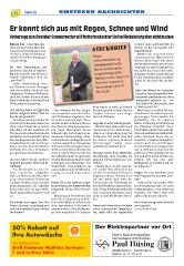 Seite 22 EMSTEKER NACHRICHTEN Er kennt sich aus mit Regen, Schnee und Wind Vorhersage zum Emsteker Sommerwetter will Wetterbeobachter Stefan Meckelnborg aber nicht machen Emstek (bd) – Diese Mal spra- Sommer dann sprichwörtlich ins chen wir mit Stefan Meckeln- Steckbrief Wasser. Ist das nun typisch oder borg, der in dieser Ausgabe zum ungewöhnlich? 26. Mal in Folge die Wettersta- Weder noch. Es kommt einem tistik für Emstek zum vergange- Name: manchmal so vor. Wenn aber die nen Jahr bringt. Stefan Meckelnborg Monate März, April, Mai warm Familienstand: ledig und trocken sind, wie wir es in den EN: Herr Meckelnborg, wie vergangenen Jahren häufiger hat- kommt es, dass wir so regelmä- Beruf: Sozialversiche- ten, zieht das einen eher unbe- ßig eine Statistik zum Wetter in rungsfachangestellter ständigen Sommer nach sich und Emstek bekommen? Sind Sie Hobbys: Lesen, Singen im für die Vegetation bzw. Landwirt- „vom Fach“? schaft ist das dann eher nachtei- Stefan Meckelnborg: Nein, Emsteker Gospelchor, lig. vom Fach bin ich nicht. Das ergab Meteorologie, aktiv in sich eher zufällig – vielleicht aus der Kirche Über das Wetter im russischen Langeweile. Es war an Weihnach- Sotschi zu den olympischen Win- ten 1984, ich war 16 Jahre alt und terspielen spekulierte man, ob es habe einfach zum Zeitvertreib ein manipuliert gewesen sei – von Wettertagebuch angelegt. den Spielen in China wusste man burg regnet es stark, in Emstek es. Was passiert da? Und seitdem haben Sie täglich das Nur teilweise. Bei den Tempe- kommen gerade einmal ein paar Man kann tatsächlich für Son- Wetter aufgeschrieben? Wie ha- raturen werden zwar die Höchst- Tropfen. Das kann auch umge- nenschein für eine bestimmte Re- ben Sie das gemacht? und Tiefstwerte abgelesen, aber kehrt der Fall sein. gion sorgen. Dafür werden Re- Zum Jahreswechsel dachte ich, ich stelle manchmal auch Unter- genwolken, die zu erwarten jetzt muss ich das auch weiterma- schiede zu den amtlichen Werten Liegt das an einer Wettergrenze? wären, rechtzeitig mit Silberjodid chen, sonst bringt das ja nichts. fest. Auch im Urlaub wird gemes- Emstek liegt erhöht auf einem per Flugzeug besprüht. Diese Also habe ich mir zunächst ein sen, dann übernimmt meine Geestrücken. Der Höhenunter- Chemikalie nimmt Wassertröpf- Thermometer gekauft und in den Schwester die Vertretung. Die ge- schied zu Cloppenburg liegt bei chen auf und lässt die Wolke früh- elterlichen Garten gestellt. Später messenen Niederschläge müss- 30 Metern. Das reicht, dass sich zeitig abregnen, bevor das ge- kam ein Regenmesser dazu. Mitt- ten korrekt sein. Anfangs hatte ich das Wetter durchaus in einem wünschte „Sonnenscheingebiet“ lerweile habe ich auch ein Schnee- noch keine geeichten Messgeräte, kleinräumigen Gebiet unter- erreicht wird. Das wird übrigens kreuz, mit dem der Schneefall zu- aber heute steht ein Regenmesser schiedlich entwickeln kann. auch in Süddeutschland gemacht, verlässig, also ohne Verwehun- des Deutschen Wetterdienstes im um zu verhindern, dass sich Ha- gen, gemessen werden kann. Garten, nach DIN genormt. Bei Konnten Sie bei Ihren Wetterbe- gelkörner in Tennisballgröße bil- der Aufstellung des Gerätes habe obachtungen eine Parallele zur den und dann große Schäden an- Und wie haben Sie die weiteren ich den Abstand zu Bäumen oder globalen Klimaerwärmung fest- richten. Ob das eine gute Angaben gemacht? Wind und Be- Gebäuden berücksichtigt. Die stellen? Maßnahme im Hinblick auf un- wölkung? Windstärke einzuschätzen ist Eindeutig: Ja. Es gibt zwar im- ser Klima ist…? Den Wind habe ich nach mei- zwar subjektiv, aber die Windrich- mer wieder besondere Jahre, die nem Empfinden angegeben: tung kann man ja durchaus erken- aus dem Trend fallen: 2012 war es Wagen sie zum Abschluss noch leicht, in Böen, stürmisch, orkan- nen. insgesamt kühler, 1996 war auch eine Prognose für Emsteks Som- artig - daraus wurde Erfahrung. ein eher kaltes Jahr. Aber der mer? Genauso verhält es sich mit dem Haben Sie in der näheren Umge- Trend zeigt eine Erhöhung der Lieber nicht. Bei meiner Win- Bedeckungsgrad: z.B. tagsüber bung interessante Begebenheiten durchschnittlichen Jahrestempe- tereinschätzung habe ich nicht heiter (also nur ein paar Wölk- festgestellt, die das Wetter betref- ratur. Diese Erhöhung wird nicht richtig gelegen, er war milder als chen), gegen Abend zieht es sich fen? von einzelnen Monaten verur- erwartet. Die Natur lässt sich zu. Man kann z.B. beobachten, dass sacht, es sind alle Monate betrof- nicht in die Karten schauen. sich über Cloppenburg bedroh- fen. Sie würden also sagen, dass Ihre lich dunkle Wolken aufbauen, die Herr Meckelnborg, vielen Dank für Daten durchaus zuverlässig sind dann irgendwann in Emstek zu Manchmal haben wir im Frühjahr das Gespräch. und mit amtlichen Daten mithal- erwarten wären. Aber häufig war- schon sommerliche Temperatu- Gerne. Vielen Dank. ten können? tet man vergeblich. In Cloppen- ren, dafür fällt der eigentliche 50% Rabatt auf Der Elektropartner vor Ort Ihre Autowäsche Elektro-Beleuchtungskörper Alarmanlagen-Antennenbau Paul Hüsing Nur Gültig an Ihren Shell Stationen Matthias Surmann 7 mal in Ihrer Nähe 49685 Bühren · Dorfstraße 6 Telefon (0 44 47) 3 07