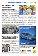 EMSTEKER NACHRICHTEN Seite 15 Von der Raupe zum Schmetterling Naturprojekt im Franziskus-Kindergarten Emstek (mh). Dass jeder Schmet- es dann auf Raupensuche. Jede terling vorher eine Raupe war, Pflanze des Spielplatzes wurde mit wussten bereits viele Kinder. Doch dem „speziellen Blick“ nach Rau- zu beobachten, wie aus einer Raupe pen untersucht, denn jedes ange- ein Schmetterling wird, war span- knabberte Blatt könnte eine Raupe nendes naturwissenschaftliches Ex- beherbergen. Das Sammeln war periment für die Schlauköpfe des mühsam, aber mit Unterstützung Franziskus-Kindergartens. der Eltern wurden schließlich Rau- Bevor es auf Raupensuche ging, pen gefunden. Die Beobachtung Beim Sammeln der Raupen wurde jedes Blatt genau untersucht. erfuhren die Kinder, woher der konnte starten. Schmetterling seinen Namen hat. In ausgedienten Aquarien fach- Schmetterlingsbücher waren auch Schmetterlingsbeet mit Sommer- „Früher machten die Menschen kundig untergebracht und ver- interessant, aber vielmehr als das flieder und lila Beetpflanzen an, aus Milch selber die Sahne und die sorgt, konnten die Kinder die Ver- waren es die tollen Naturbeobach- weil Schmetterlinge die Farbe Lila Sahne hieß Schmetten. Weil die puppung der Raupen und das tungen, die unsere Kinder be- besonders wahrnehmen. Schmetterlinge immer um den Schlüpfen miterleben. Ein Schach- schrieben haben“, sagten die pro- Einige Kinder der Schmetter- Sahnetopf herumflogen, wurden brettschmetterling schlüpfte als jektbegleitende Erzieherinnen. lingsgruppe bauten ein Insekten- sie einfach Schmetterlinge ge- Erstes aus seinem Kokon, einige Selbst in der Brückenjahraktion „ hotel. Mit Reisig, Holzscheiben, nannt“, gaben die zukünftigen Nachtfalter folgen kurz darauf. Schule spielen in der Schule“ wa- Rinde, Laub und einem Ziegelstein Erstklässler stolz ihr Wissen an die „Das Schöne an dem Projekt waren ren Schmetterlinge das Thema. wurde das Haus eingerichtet. Nun Kindergartengruppen weiter. die Begeisterung und das lang an- Um Schmetterlinge anzulocken, hat es auf dem Spielplatz einen Vom Raupenfieber gepackt, ging haltende Interesse der Kinder. legten die Kinder ein kleines Standort gefunden. DER NEUE RENAULT MÉGANE: JETZT PROBE FAHREN! Mit Trommeln arbeiten die Kids in der gemeinsamen Musik-AG. Trommeln und gestalten Kooperation HRS Emstek mit St. Vincenzhaus Emstek (fh). Seit zwei Jahren be- einer Kunst AG, die sich derzeit mit steht die Zusammenarbeit der einer Mosaikarbeit befasst. Es wer- Haupt- und Realschule Emstek den Säulen mit afrikanischen Moti- RENAULT MÉGANE GRANDTOUR AUTHENTIQUE (HRS) mit dem St. Vincenzhaus in ven gestaltet, die zuerst im Lichthof 1.6 16V 110 Cloppenburg. Gestartet wurde mit der HRS und später im Vincenz- haus ausgestellt werden. ab 14.990,– € Die positiven Erfahrungen aus der Kunst-AG weckten den Wunsch nach mehr Zusammenar- Renault Mégane Grandtour 1.6 16V 110: Gesamtverbrauch (l/100 km): innerorts 9,4; außerorts 5,5; kombiniert 6,9; CO 2-Emissionen kombiniert: beit beider Schulen und so wurde 159 g/km. Renault Mégane Grandtour: Gesamtverbrauch kombiniert (l/100 die kooperative Musik-AG einge- km): 7,3 – 3,5; CO 2-Emissionen kombiniert (g/km): 169 – 90 richtet. Sie starteten damit, eigene (Werte nach Messverfahren VO [EG] 715/2007). Trommeln herzustellen. Dass sie diese inzwischen auch musikalisch Besuchen Sie uns im Autohaus. Wir freuen uns auf Sie. beherrschen, konnten sie im Juni auf einem Fest im Vincenzhaus der Justus von Liebig Str.1 Öffentlichkeit präsentieren Die ge- 49685 Emstek meinsame Arbeit macht allen sehr Tel.: 0 44 73 / 92 688-0 viel Spaß und Freude und soll des- GmbH & Co. KG Fax: 0 44 73 / 92 688-190 In der Kunst-AG werden Mosaik- halb im nächsten Schuljahr unbe- arbeiten hergestellt. dingt weitergeführt werden. Abbildung zeigt Renault Mégane 5-Türer GT-Line mit Sonderausstattung.