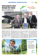 EMSTEKER NACHRICHTEN Seite 23 Solarcarport nutzt Energie der Sonne Anlage der Firma Kühling installiert Hoffen auf Sonne: Frank Hermes (Zentrum Zukunft), Heinrich Kühling und Ralf Kuper (v.l.) vor dem Solarcarport. Foto: ecopark Drantum (uh). Solarenergie wird Möglichkeit der eigenen Stromer- dem können wir mit dem Solar- werk mit einer elektrischen Leis- im künftigen Energiemix eine be- zeugung und ist damit ein weiteres strom die Akkus unserer Elektro- tung von 4 KWp hat als Zielgruppe deutende Rolle einnehmen, betont Anwendungsbeispiel für die Ener- fahrräder oder von Elektrofahrzeu- neben Privatleuten „vor allem Ge- die EWE NETZ GmbH. Der regio- giewende im eigenen Zuhause“, sagt gen auffüllen.“ werbe- und Industriebetriebe, für nale Netzbetreiber hat kürzlich im Ralf Kuper, Leiter der Netzregion Auch optisch passt das neue Car- die eine Kombination aus Eigen- Zentrum Zukunft im ecopark eine Cloppenburg/ Emsland von EWE port perfekt zum markanten Zen- stromnutzung und Elektromobili- Photovoltaikanlage der H. Kühling NETZ. „Der Carport ergänzt die trum Zukunft am ecopark-Kreisel. tät attraktiv ist“, erläutert Heinrich Stahl- und Metallbau GmbH aus Photovoltaikanlage auf dem Dach Zwar wiegt die Stahlkonstruktion Kühling. Sein Unternehmen hat Friesoythe auf einem Carport in- des Hauptgebäudes. Der erzeugte mit dem 24-Quadratmeter-Dach den Solarcarport entwickelt, es baut stalliert. Strom wird im Haus direkt genutzt vier Tonnen, doch sie wirkt eher luf- und montiert ihn in verschiedenen „Der Solarcarport bietet die oder in Batterien gespeichert. Zu- tig und leicht. Das kleine PV-Kraft- Größen. Das ideale Umfeld. Unternehmer im ecopark wissen: Wo Mitarbeiter sich wohlfühlen, da leisten sie gute Arbeit. Investieren auch Sie in ein gutes Umfeld – für Ihre Mitarbeiter und für Ihr Unternehmen. Im ecopark an der Hansalinie A1. ecopark – der Qualitätsstandort.