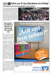 - Anzeige - Fahrt zur N-Joy Starshow ein Erfolg! Tolle Show mit vielen Highlights und Krachern Am 31. Mai ging es bei strahlendem Sonnen- schein mit 140 Kindern und Jugendlichen der Volksbanken und Raiffeisenbanken im Land- kreis Cloppenburg, davon 14 aus Emstek, nach Hannover zur N-Joy Starshow. Auch in diesem Jahr haben sich die Organisatoren der Starshow nicht lumpen lassen und holten ein paar „echte Knaller“ wie Madcon, Materia und Flo Rida auf die Expo-Plaza. Nach einem aufregenden Tag ging es am späten Abend gut gelaunt, aber erschöpft zurück nach Emstek. Das nächste große SIZE-Highlight ist die Fahrt zum Halloween-Spezial im Heideapark Soltau am 25. Oktober. Genossen- schaftliche Beratung: Beratung, die anders ist! Egal, was Sie antreibt, wir bera- ten Sie persönlich, individuell, fair, transparent und partner- schaftlich. Denn diese genossen- schaftlichen Werte sind die Grundlage unserer Beratung. Da Sie bei uns als Kunde und Mitglied mit Ihren Zielen und Wünschen im Mittelpunkt ste- hen, haben wir unsere Bera- tungszimmer noch besser hier- auf abgestimmt. Jedes Bera- tungszimmer verfügt jetzt über einen großen Fernseher, um Ih- nen die Themen der Finanzwelt einfach und verständlich näher zu bringen. Die ganzheitliche Beratung steht hierbei im Vor- dergrund. Genau aus diesem Grund, bekommen Sie immer die Lösungen, die zu Ihnen pas- sen. Dabei unterstützen uns bei speziellen Beratungsthemen auch unsere Partner der Genos- senschaftlichen FinanzGruppe der Volks- und Raiffeisenban- ken. Jeder Mensch hat etwas, das ihn antreibt. Und zu guter Letzt, kommt es in der Beratung nicht nur darauf Wir machen den Weg frei! an, dass man miteinander spricht, sondern auch wie. Unse- re Berater sprechen mit Ihnen kein Fachchinesisch, sondern einfach und verständlich. Unser Ziel ist es, dass Sie uns langfristig vertrauen. Denn Vertrauen ist die Basis unserer Zusammenar- beit.