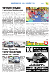 EMSTEKER NACHRICHTEN Seite 9 Wir machen Musik! 10 Jahre Musikalische Früherziehung in Emstek Emstek (kb). Aufgeregt stürmen gen und Musizieren im Vorder- die ca. zehn Kinder im Vorschulal- grund stehen. ter in die Alte EVG, versammeln Das gemeinsame Singen von Lie- sich mit Agnes Beckmann auf dem dern mit Begleitung durch Orffsche großen Teppich und freuen sich Instrumente steht im ersten Jahr im sichtlich auf das wöchentliche ge- Vordergrund. Dabei setzen die Kin- meinsame Singen und Musizieren. der Rhythmen, Klänge und Musik- Vor zehn Jahren startete Agnes stücke in Bewegung um und lernen Beckmann zunächst in der Turn- so Grundbewegungsarten und halle des Maria-Goretti-Kindergar- Tänze kennen. Erste musikalische tens mit der „Musikalischen Früh- Begriffe, wie laut und leise, schnell erziehung“. „Musikalische Früher- und langsam, hoch und tief, werden ziehung ist ein ganzheitliches Ange- erarbeitet, Fingerspiele gespielt und Auf spielerische Weise lernen die Kinder bei Agnes Beckmann bot, in dem Sprache, Singstimme, Klanggeschichten gestaltet. musikalische Grundlagen. Foto: Lünnemann Rhythmusgefühl und Motorik ge- Im zweiten Unterrichtsjahr steht fördert werden“, erklärt Agnes das Kennenlernen der Orchesterin- strumente hautnah erleben. „Dass Ein neues Angebot für die Musi- Beckmann. „Kinder sind sehr krea- strumente auf dem Programm. das Angebot schon Früchte getra- kalische Früherziehung für Kinder tiv, wenn es darum geht, Klänge zu Diese werden von Schülern der Mu- gen hat, konnte ich im Frühjahres- ab vier Jahren startet voraussicht- produzieren, Liedtexte zu erfinden sikschule vorgestellt und dürfen konzert des Blasorchesters St. Cäci- lich am Montag, 6. Oktober. Es fin- oder Geschichten zu verklangli- von den Kleinen auch ausprobiert lia Emstek feststellen. Sowohl im det nachmittags einmal wöchent- chen. Dieses zu erleben, macht ein- werden. So bekommen die Kinder Jugendblasorchester als auch im lich in der Alten EVG in Emstek fach großen Spaß“, hebt sie das Be- eine Vorstellung davon, welches In- Blasorchester spielen Kinder mit, statt. Die Kinder werden altersent- sondere der Musikalischen Früher- strument ihnen gefällt und welches die die „Musikalische Früherzie- sprechend eingeteilt. ziehung hervor. sie später selbst gern erlernen hung“ besucht haben. Das Vorstu- Interessierte können sich anmel- Bisher haben 370 Kinder an den möchten. fen-BLO besteht sogar fast nur aus den bei Agnes Beckmann unter Te- Kursen teilgenommen. Auf spiele- Ein Höhepunkt ist der Besuch ehemaligen Früherziehungskin- lefon 04473/928969 oder in der rische Weise werden den Kindern des Vorstufen-Blasorchesters Em- dern und Krabbelmäusen. Darauf Musikschule Romberg e.V. unter musikalische Grundlagen vermit- stek. Hier können die Kinder das bin ich schon ein bisschen stolz“, Telefon 04443/1426. Anmelde- telt, wobei Freude und Spaß am Sin- Zusammenspiel verschiedener In- freut sich Agnes Beckmann. schluss ist der 30.Juli. - Anzeige - - Anzeige - Boxer Kipper für 100 Busse und vielfältigen Einsatz Transporter Peugeot Boxer Kipper 2,2 HDI mit AHK Emstek (en). maanlage, elek- Für vielfältigen trischer Au- Einsatz ist der ßenspiegel, Peugeot Boxer Beifahrer- Kipper geeig- Doppelsitz, net, der beim Colorvergla- Autohaus Rie- sung, Fahre- mann angebo- rair-bag, Lei- ten wird. Das tergestell, Mit- z.B. Doka, Pritschen usw. Fahrzeug mit Fotos © Autohaus Riemann telarmlehne, Tageszulassung (Tachostand 5 km), Radiovorbereitung, Servolenkung, von VW, DB, MAN usw. bis 7,5 t. das jeder Autofahrer mit Führer- Tempomat, Wegfahrsperre, Euro5, scheinklasse B fahren darf, hat einen elektrische Fensterheber und Zen- 2,2-HDI-Motor mit 131 PS/96 kW tralverriegelung mit Fernbedie- www.Auto-Riemann.de (grüne Umweltplakette). Der Drei- nung. Brutto-Verkaufspreis sitzer ist mit vielen Extras ausgestat- 23.740,50 Euro (Mwst ausweisbar), Emstek · Tel. 0 44 73 / 92 93 20 tet: ABS, 6-Gang Getriebe, Kli- Netto 19.950 Euro.