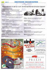 Seite 14 EMSTEKER NACHRICHTEN Gottesdienste in der ev.-luth. Kirchengemeinde Emstek/Cappeln 1. Adventssonntag, 30. November 9.30 Uhr Gottesdienst in der St.-Laurentius-Kirche Emstek 11.00 Uhr Gottesdienst in der St.-Martins-Kirche Cappeln 14.00 Uhr Kindersachenflohmarkt im Gemeinderaum der St.-Martins- Kirche Cappeln 2. Adventssonntag, 7. Dezember 9.30 Uhr Gottesdienst unter Bläserklängen vom Posaunenchor Emstek mit Kindergottesdienst in der St.-Laurentius-Kirche in Em - stek 15.00 Uhr Musikalischer Gottesdienst mit dem Singkreis in der St.-Mar- tin-Kirche Cappeln, anschließend Gemeinde-Adventsfeier 9.30 Uhr Gottesdienst in der St.-Laurentius-Kirche Emstek 11.00 Uhr Gottesdienst in der St.-Martin-Kirche Cappeln Mittwoch, 10. Dezember 15.00 Uhr Seniorenadventsfeier in der St.-Laurentius-Kirche in Emstek 2. Weihnachtsfeiertag 17.00 Uhr Adventliche Bläsermusik des Posaunenchores im Senioren- 9.30 Uhr Gottesdienst mit Musikkorps Höltinghausen in der St.-Lau- heim St.-Margaretha in Emstek rentius-Kirche Emstek 3. Adventssonntag, 14. Dezember Sonntag 28. Dezember 9.30 Uhr Gottesdienst in der St.-Laurentius-Kirche Emstek 9.30 Uhr Gottesdienst in der St.-Laurentius-Kirche Emstek 11.00 Uhr Gottesdienst in der St.-Martins-Kirche Cappeln 11.00 Uhr Gottesdienst in der St.-Martin-Kirche Cappeln 4. Adventssonntag, 21. Dezember 9.30 Uhr Gottesdienst in der St.-Laurentius-Kirche Emstek Silvester, 31. Dezember 11.00 Uhr Gottesdienst in der St.-Martins-Kirche Cappeln 16.30 Uhr Jahresschlussgottesdienst in der St.-Laurentius-Kirche in Ems- tek Gottesdienste an Heilig Abend Sonntag, 4. Januar 2015 15.00 Uhr Familiengottesdienst in der St.-Laurentius-Kirche in Emstek 9.30 Uhr Gottesdienst in der St.-Laurentius-Kirche in Emstek 16.30 Uhr Christvesper mit Posaunenchor in der St.-Laurentius-Kirche 11.00 Uhr Gottesdienst in der St.-Martin-Kirche in Cappeln in Emstek 18.00 Uhr Christvesper in der St.-Martin-Kirche in Cappeln Epiphanias Montag, 6. Januar 2014 22.30 Uhr Christmette in der St.-Laurentius-Kirche in Emstek 19.00 Uhr Epiphaniasgottesdienst mit dem Posaunenchor in der St.-Lau- rentius-Kirche 1. Weihnachtsfeiertag n W ohnambiente W ohnambiente Für Haus und Garten Inh.: Monika Emken Inh.: Monika Emken Inh.: Monika Emken Tel.: 04473/9430044 Tel.: 04473/9430044 Tel.: 04473/9430044 Cloppenburg Emstek „Sie sind Unternehmer Vechta und möchten dabei sein? Jetzt anmelden unter www.hgv-emstek.de Containerpflanzen 25% Rabatt „Gärtner mit Herz“ in Ihrer Nähe „Gärtner mit Herz“ in Ihrer Nähe Verkauf im Außenbereich Langestraße 42 · 49685 Emstek Verkauf im Außenbereich: Langestraße 42 49685 Emstek Gartenjuwelen f ür I hr en T r aumgar t en Gartenjuwelen f ür I hr en T r aumgar t en WAL TRA U D JABCZYNSKI Ihre Terapeutin bei Sprach-, Sprech- und Stimmauffälligkeiten für Kinder und Erwachsene Antoniusstraße 17 · 49685 Emstek Telefon 0 44 73 / 94 33 180 · Fax 0 44 73 / 94 35 928