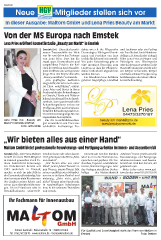 ANZEIGE Neue -Mitglieder stellen sich vor In dieser Ausgabe: Maltom GmbH und Lena Pries Beauty am Markt Von der MS Europa nach Emstek Lena Pries eröffnet Kosmetikstudio „Beauty am Markt“ in Emstek Emstek (jw) – Eines der luxuriö- dukte wie z.B. die Pflegereihe und Lackieren oder ein Peeling sesten Traumschiffe der Welt Dermalogica Hildegard Brauk- mit Paraffinbad. Auch Nadelmo- war für zwei Jahre das Zuhause mann und Produkte von Jane dellage, z.B. French oder Farbgel, von Lena Pries. Dort hat die Iredale für dekorative Kosmetik. führt Lena Pries an Finger- und staatl. gepr. Kosmetikerin und Vor jeder Behandlung gibt es Fußnägeln aus. Warmwachs ausgebildete Frisörin die Rei- eine intensive Beratung zum oder Zuckerpaste werden für die chen der Welt im Spa behandelt. Hauttyp, so dass die Pflegepro- Haarentfernung im Gesicht oder Jetzt eröffnete die weit gereiste dukte individuell abgestimmt am Körper verwendet. Körper junge Frau das Kosmetikstudio werden können. und Geist erhalten Entspannung „Beauty am Markt“ in Em stek. Zur Maniküre bzw. Pediküre bei Massagen oder einer Ohren- „Ein gepflegtes Auftreten gehören Nagelpflege, Handbad kerzenbehandlung. sorgt dafür, das wir uns in unse- rer Haut wohlfühlen“, erklärt Lena Pries und bietet in ihren Studio zahlreiche Behandlungen an. Gesicht, Hände und Füße er- halten hier allergrößte Aufmerk- samkeit. Zwei geschmackvolle Behandlungsräume stehen zur Verfügung, jeder mit einem kom- fortablen Behandlungsstuhl. De- zente Beleuchtung sorgt für eine angenehme Atmosphäre. Lena Pries hat „Beauty am Für die Gesichtsbehandlun- beauty-am-markt@gmx.de Markt“ in Emstek eröffnet. gen verwendet Lena Pries aus- www.beautyammarkt.de Foto: Jutta Wilde schließlich hochwertige Pro- „Wir bieten alles aus einer Hand“ Maltom GmbH bietet professionelle Renovierungs- und Fertigungsarbeiten im Innen- und Aussenbereich Emstek (bd) – Die Firma Maltom renzliste kann sich sehen lassen. Gemeinsam mit den Kunden „Maltom“ bietet professionelle GmbH ist neues HGV-Mitglied 2012 gründete er die Firma „Mal- wird vor Ort das Vorhaben be- Renovierungs- und Fertigungs- in Emstek geworden. Doch To- tom GmbH“. sprochen und geplant. Ob Tro- arbeiten im Innen- und Aussen- masz Zamirski ist keineswegs „Wir bieten alles aus einer ckenbau, Tapezier- und Malerar- bereich an. Und den Service, der ein Unbekannter. Bereits seit Hand“, nennt „Maler Tomasz“ ei- beiten, Kabelverlegungen oder gewünscht wir. 1993 wohnhaft in Emstek, nen Vorzug seines Teams. Mit das Verlegen sämtlicher Boden- Mehr Infos unter www.mal- machte er sich im Jahr 2005 in seinen qualifizierten Mitarbei- beläge – der Meis terbetrieb tom.de oder unter 0162/6732618. der Gemeinde selbstständig. Seit- tern ist er äußerst flexibel und dem konnte er viele Kunden von vielseitig. „Geht nicht, gibt’s der Qualität seiner Arbeit und nicht!“ könnte seine Parole sein. seiner Zuverlässigkeit überzeu- In regelmäßigen Schulungen gen. Ob im Privathaus oder in lernt er die neuesten Techniken Geschäftsräumen – seine Refe- und Trends. Ihr Fachmann für Innenausbau Tomasz Zamirski · Wiesenstraße 16 · 49685 Emstek Für Qualität und Zuverlässigkeit steht das Team von Maltom in Tel. 0162/6732618 · www.maltom.de · thomas@maltom.de Emstek. Foto: Deeken