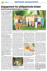 Seite 24 EMSTEKER NACHRICHTEN Engagement für philippinische Kinder Marlies Witte unterstützt die Ziele der Reunion e.V. Cloppenburg EN: Frau Witte, Sie haben die Aktion „Tag der offenen Gartenpforte“ genutzt, um Spendengelder für ein Projekt zu sammeln, das Ihnen besonders am Herzen liegt. Marlies Witte: Ja, das war ein toller Erfolg! Wir haben über 3.300 Euro an Spenden bekommen, die wir für ein 12-jähriges Mädchen auf den Philippinen einsetzen möchten. Patricia muss eine Beinprothese tragen. Sie soll nun eine ordentliche, individuell angepasste Prothese be- kommen, mit der sie mobil ist und mehr Lebensfreude hat. Sie hat bei einem Schulwettbewerb in den Fä- chern Mathematik und Englisch gewonnen. Nun wurde sie von der Schule gebeten, sie im Wettbewerb auf nächster Ebene zu vertreten. So wird sie erst nach dem Wettbewerb nach Manila in eine orthopädische Klinik fahren. Gern hätte ich ein Spendenübergabe durch einen Teil der Klasse an Marlies Witte persönlich. Foto mit Patricias neuer Prothese gezeigt, aber sie ist sehr stolz auf rem Examen für ein Jahr auf der In- Kindergartens. Der bisherige Kin- Schulgeld, Hefte, Schuluniform und ihre Leistung und möchte gerne sel Tablas. Zudem ist meine Kollegin dergarten aus Nippa-und Bambus- alles weitere gekauft. Die Kinder die Schule vertreten. und Freundin Magdalene Lügan matten und einem Dach aus Well- sind sehr dankbar und lernen fleißig. Sie haben für Ihr Engagement Mitbegründerin und Vorsitzende blech wurde immer wieder durch Sie wissen dieses Geschenk zu sogar schon Unterstützung in des Vereins. Durch diese beiden Regen und Sturm zerstört. Bei ei- schätzen. Jeder Pate bekommt ein der Nachbarschaft gefunden. Krankenschwestern erhielt ich in nem Besuch im Februar 2013 ent- Foto von „seinem“ Kind und einige Ja, ich habe mich ganz besonders den Jahren 2012 und 2013 die Ge- stand die Idee zum Bau eines neuen Kinder schicken Kopien ihrer Zeug- über unsere Nachbarkinder Marina legenheit, mit auf die Philippinen Kindergartens. Ein Spendenaufruf nisse zu. Sie sind so stolz darauf! und Max Niemöller gefreut. Deren zu reisen und die Projekte vor Ort und Aktionen des Vereins brachten Hilfe zur Selbsthilfe und ein Leben Klasse, Schülerinnen und Schüler kennenzulernen. Auch nach zwan- die notwendigen 8000 Euro zusam- in Würde ist das Motto des Ver- der Liebfrauenschule Cloppenburg, zig Jahren bestehen die Kontakte men, und bereits im Februar 2014 eins! haben bei verschiedenen Aktionen und die Zusammenarbeit mit der Weitere Projekte sind Armen- 241,20 Euro Geld gesammelt. In- Partnergruppe sowie zu Menschen, speisungen, die Anschaffung von nerhalb der Klasse hat man sich für die sich in Deutschland und vor Ort Fischerbooten und Fahrradtaxen, den Vorschlag von Marina und Max auf den Philippinen engagieren. Sie die Versorgung mit Kleidung, me- entschieden, das Geld für Patricias gewährleisten den hundertprozen- dizinischen Hilfsgütern oder auch neue Prothese zu verwenden. Die tigen Einsatz der Spenden für die Spielsachen durch Sachspenden. Aktionen wurden von Religions- geplanten Projekte. Nun suche ich für eine Schulzahn- lehrer Kokenge unterstützt. Die arme Bevölkerung der Phil- ärztin dringend eine zahnärztliche Wie kommen Sie auf die Idee, ein ippinen hat nicht viel zum Leben, Einheit. Hat eines von den ca. 10.000 Projekt in den Philippinen zu un- doch sie ist äußerst freundlich, hilfs- zu betreuenden Schulkindern Zahn- terstützen? Immerhin sind die bereit sehr erfinderisch und ge- schmerzen, so wird zurzeit der Zahn Philippinen ein Inselstaat mit schickt, ihren Alltag zu meistern. Patricias bisherige alte Holzpro- gezogen. Vielleicht findet sich ein über 7000 Inseln – die Auswahl Deshalb war es für mich keine Frage, these, an der ein selbstge- Zahnarzt, der Pate für dieses Projekt bestimmter Inseln kann kein Zu- dass ich mit meinen Möglichkeiten schnitzter Holzfuß mit einem sein möchte? fall sein. auch etwas zur Unterstützung bei- dicken Nagel befestigt ist. Da ich gesehen habe, dass das Zu den Philippinen, genauer zu trage. Geld wirklich für gute Projekte ge- den beiden Inseln Panay (Iloilo) konnte der Kindergarten feierlich nutzt wird, bemühe ich mich, den und der Region Romblon (Tablas), eingeweiht werden. Verein Reunion Cloppenburg e.V besteht seit vielen Jahren Kontakt Wie hilft die Reunion neben sol- bekannter zu machen und Gelder über den Verein Reunion e.V. Clop- chen Einzelaktionen wie Patricia sowie Sachspenden zu organisieren. penburg - einem Verein, der dort oder den Bau eines Kindergar- Bei einer erneuten Reise werde ich Hilfsprojekte für Bedürftige, vor al- tens? Gibt es eine Art Hilfspro- dann die verschiedenen Projekte lem für Kinder und Frauen, unter- gramm? besuchen. stützt. Vor 20 Jahren gründete ein Die Reunion vermittelt Paten- Helfen kann so einfach sein – Freundeskreis aus Cloppenburg schaften für Kinder, die zwar zur man muss es nur tun! Wer mehr den multikulturellen Verein. Einige Schule gehen können, aber kein über die Arbeit der Reunion Clop- davon sind Krankenschwestern. Sr. Ein großes Projekt war der Bau Geld haben, um sich ein Mäppchen penburg e.V. erfahren möchte oder Gloria Bachoco, die seit 23 Jahren eines Kindergartens. oder Hefte zu kaufen. Für nur 35 ebenfalls helfen möchte, kann in Cloppenburg lebt, stellte den Genau, das zuletzt größte Projekt Euro im Jahr – das ist die Höhe einer sich an Magdalena Lügan, 04471 Kontakt her. Sie arbeitete nach ih- war der Bau eines neuen, massiven Patenschaft – werden für ein Kind – 82818 wenden.