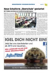 EMSTEKER NACHRICHTEN Seite 35 Neue Schulform „Oberschule“ gestartet Mit 72 Schülern in drei Klassen hat in Emstek die Oberschule begonnen Emstek (fh). Seit diesem Schul- ein Instrument lernen, das güns- halbjahr ist die neue Oberschule in tig gemietet werden kann, und be- Emstek mit drei Klassen und 72 kommt Unterricht von einem Schülern gestartet. Was ist neu? Lehrer der Kreismusikschule Die starre Unterteilung in Haupt- Cloppenburg. Gemeinsam spie- und Realschule ist weggefallen. Die len dann diese Schüler in einer Schüler werden jetzt gemeinsam Band. ab Klasse 5 unterrichtet, jedoch Zur Oberschule gehört ein wird ab Klasse 6 in den Hauptfä- neues Angebot der Mensa. Die chern Mathematik und Englisch in Gerichte können vorab online be- zwei Kursen unterrichtet. Somit stellt und bezahlt werden. können die Schwächen aufgearbei- Auch die Klassenräume der tet und Stärken gefördert werden. Oberschule wurden neu einge- Ebenso erfolgt dies auch ab Klasse richtet und auf die Bedürfnisse 8 in Deutsch. Der Schulformwech- der Schüler und Lernformen wie sel fällt folglich weg und am Ende z.B. Gruppenarbeiten hin opti- ist für alle Schüler ein Erweiterter miert. Insgesamt wurden bis jetzt Realschulabschluss möglich. 18 multimediale Whiteboards in Weiterhin wurde das Ganztags- Neu eingerichtet wurden die Klassen der neuen Oberschule in den Klassen installiert. Weiterhin angebot ausgebaut: Es findet nun Emstek. Foto: Hackmann stehen zwei optimierte Compu- an zwei Nachmittagen Unterricht terräume zur Verfügung. statt. An den anderen Nachmitta- ganz nach den Bedürfnissen des chern Werken, Musik und Kunst Die Gemeinde Emstek hat im gen können die Angebote freiwil- einzelnen Schülers. weitere Kurse gewählt werden. Zuge der Neugestaltung der lig genutzt werden. Durch diese Außerdem können in den zwei Ein Beispiel für so einen Kurs ist Oberschule 90.000 Euro und da- Erneuerung gibt es zusätzlichen Schwerpunkten „Soziales“ und das Projekt „1st class Rock“. Jeder mit in die Zukunft ihrer Kinder Förder- und Forderunterricht „Musisch-kreativ“ und den Fä- Schüler kann in diesem Projekt investiert.