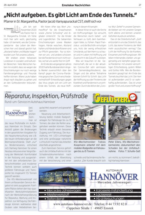 tet mit den erforderlichen Da- mit der Versicherung und einer paratur. „Der Kunde braucht sich tigt Hartwig Hannöver.