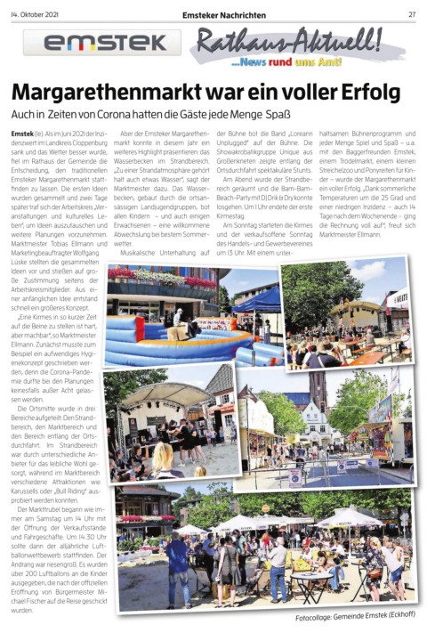 Emsteker Margarethenmarkt statt- halt auch etwas Wasser“, sagt der Am Abend wurde der Strandbe- der – wurde der Margarethenmarkt