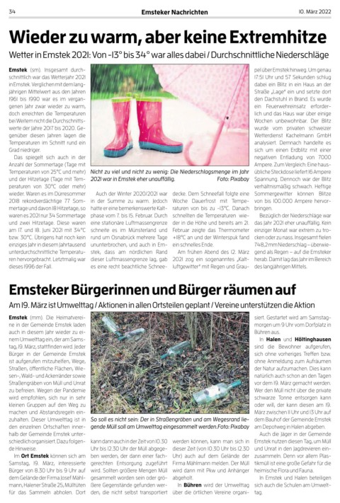 und der Hitzetage (Tage mit Tem- 2021 war in Emstek eher unauffällig. Foto: Pixabay Spannung. Dennoch war der Blitz