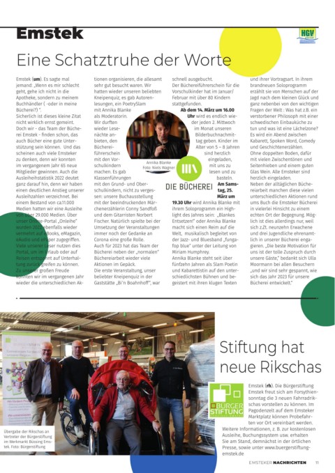 einem Bestand von ca.11.000 mit der beeindruckenden Mär- 19.30 Uhr wird Annika Blanke mit ums Buch die Emsteker Bücherei