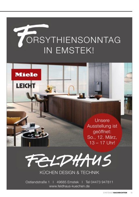 ORSYTHIENSONNTAG IN EMSTEK! Unsere Ausstellung ist geöffnet: So., 12. März, 13 – 17 Uhr! KÜCHEN DESIGN & TECHNIK Ostlandstraße 1 I 49685 Emstek I Tel 04473 947811 www.feldhaus-kuechen.de EMSTEKER NACHRICHTEN 13