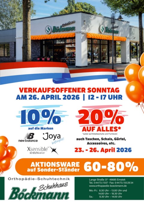 VERKAUFSOFFENER SONNTAG 7 2 AM 26 . APRIL 2026 | 1 - 1 UHR 10% 20% auf die Marken AUF ALLES* *außer auf Arbeitsschuhe und Furnituren auch Taschen, Schals , Gürtel, Accessoires, etc. 6 2 . - 2 . April 2026 3 auf Sonder-Ständer 60-80% AKTIONSWARE