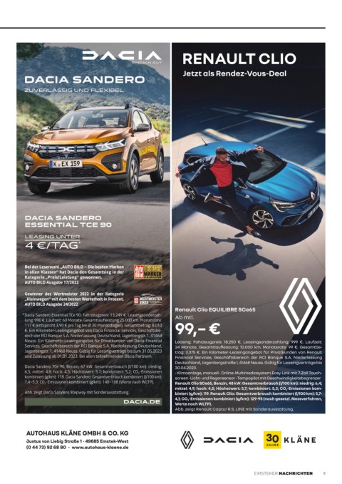 Services, Geschäftsbereich der RCI Banque S.A. Niederlassung Deutschland, 24 Monate. Gesamtlaufleistung: 10.000 km. Monatsrate: 99 €. Gesamtbe-