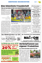 EMSTEKER NACHRICHTEN Seite 11 Eine felsenfeste Freundschaft Landgasthof Petrus und Jesus lernten die Kinder bei den Kinderbibeltagen genauer kennen Feldhaus Höltinghausen (sp). Zu den Kin- Brooklandstr. 2, 49685 Halen derbibeltagen der ortsübergreifen- Tel.: 04473/1322 den Kirchengemeinden trafen sich Saalbetrieb, Kaminzimmer, 120 Kinder aus Emstek, Halen und Kegelbahn, Partyraum, Höltinghausen. Das Motto lautete: Party-Service „Mensch Petrus - Jesus und Petrus eine felsenfeste Freundschaft“. Christmas-Flair im Dezember 2014 Denken Sie jetzt schon an Ihre Weihnachtsfeier! Reservieren Sie unseren Saal, unseren Partyraum „Papillon“ Die Kinder des fünften bis sieb- oder unser Kaminzimmer ten Schuljahres hatten sich ge- und genießen Sie die vorweih- meinsam auf den Weg zur Teich- Den Beruf des Fischers lernten die Kinder beim Blockhaus in wirtschaft in Ahlhorn gemacht, Ahlhorn näher kennen. nachtliche Atmosphäre in um Petrus näher kennenzulernen. Ihrem Lichterglanz. Mit Spielen und Mitmachange- Die Grundschüler haben an Mensch Petrus, das ist einer wie Erleben Sie einen lustigen Abend boten haben die Mädchen und zwei Tagen in den Räumlichkei- du und ich". Die Kinder haben mit auf unserer Kegelbahn oder Jungen viel über Petrus erfahren ten des Höltinghauser Pfarrhei- sehr viel Freude unter anderem und bekamen vor Ort noch fach- mes bzw. des angrenzende Kin- Freundschaftsbänder sowie lassen Sie sich außer Haus von männische Erläuterungen über dergartens bei altersgerechten Boote gebastelt oder auch Fische unserem Partyservice verwöhnen. den Beruf eines Fischers. Zum Ab- Rollenspielen, Geschichten, Spie- aus Filz hergestellt. Der Ab- Wir freuen uns, Sie als unsere schluss gab es gemeinsam mit vie- len und kreativen Angeboten he- schlussgottesdienst für die Gäste begrüßen zu dürfen. len Eltern und Großeltern einen raus gefunden, dass wir alle in Pe- Grundschüler fand am Sonntag in Wortgottesdienst in der Kapelle trus vieles von unserem eigenen der Höltinghauser Kirche mit der Ihr Feldhaus-Team beim Blockhaus in Ahlhorn. Wesen wiederfinden, denn "der Gemeinde gefeiert. Der Elektropartner vor Ort Elektro-Beleuchtungskörper Alarmanlagen-Antennenbau Paul Hüsing 49685 Bühren · Dorfstraße 6 Telefon (0 44 47) 3 07 Herbstpflanzen aus 19. Oktober 2014, von 13 - 18 Uhr9. Oktober 20114, von 13 - 18 Uhhr 1 eigener Produktion Verkaufsoffener Sonntagfofsauffskauffsk s offfe a tag Ver ener Sonnt Ver f fe fener Sonn g g g nur So., 19.10., nur So., 19.10., nur So., 19.10., auf von 13 - 18 Uhr.von 13 - 18 Uhr. von 13 - 18 Uhr. auf Am 19. Oktober verkaufsoffener Sonntag von 13 bis 18 Uhr 20% % 20% alles! s!eall Bühren (en) - Zu einem verkaufsof- Bei uns die größte Au ws ahl fenen Sonntag lädt die Gärtnerei Bei uns die größte Auswahl Bei uns die größte Au F ormgehöl an Formgehölzen weit Meyer in Bühren am 19. Oktober ein. an zen en eit w Die Besucher können sich von der und breit und großer und breit und großer Vielfalt der herrlichen Pflanzen über- und breit und großer zeugen, die Gärtnermeister Stefan Schauga r ten! Schaugarten! Meyer in eigener Produktion her- Individuell gefe Individuell gefertigte Grabgestecke.tigte Grtigte G rabgestecke. stellt. Im Sortiment befinden sich u. abgestecke. a. Alpenveilchen, Stiefmütterchen und Hornveilchen in absoluter Spit- Unsere Öffnungszeitene ÖffnungszeitenrUnse e Öffnungszeiten zenqualität zum niedrigen Preis. Montag bis Freitag Eine weitere Spezialität der Gärtnerei Gärtnerei Meyer eine Vielfalt an ge- Montag bis F eitag r 8-18.30 Uhr 8-18.30 Uhr Samstag 8-16 Uhr Samstag 8-16 Uhr sind exklusive Formgehölze, die auf schmackvollen Grabgestecken zu Sonntag, 19.10. 13-18 Uhr Sonnta , g 19.10 . 13-18 Uhr einer Fläche von 8000 Quadratme- bieten. Von Garten- bis Grabgestal- 13-18 Uhr tern bereitstehen. Außerdem hat die tung – alles aus einer Hand!