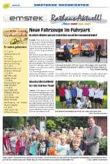 Seite 20 EMSTEKER NACHRICHTEN ...News rund ums Amt! Neue Fahrzeuge im Fuhrpark Ein Aufsitz-Allmäher und zwei Dacia Dokker neu auf dem kommunalen Bauhof Emstek. Über drei neue Fahr- zeuge freuen sich die Mitarbei- ter des kommunalen Bauhofs. Es haben geheiratet Seit Juni sorgt ein Aufsitz-All- mäher der Firma AS für Mähar- beiten an den Regenrückhalte- 17. 7. 2014: becken. Matthias Baier und Mit einem ausgereiften Hoch- Doris Folz gradmähwerk und permanen- 18. 7. 2014: ten Allradantrieb ist es möglich, Michael Krieger und jeglichen Hang im Gemeinde- Monique Hörning gebiet zu pflegen. Ebenfalls neu 26. 7. 2014: beschafft wurden zwei Dacia Fuhrpark erweitert: Mit den neuen Fahrzeugen sind Josef Beh- Dokker vom Autohaus Kläne, rens und Reinhold Niemann (Mitte) in der Gemeinde Emstek un- Matthias Vocke und Westeremstek. terwegs. Foto: Renate Abeling Stephanie Behrendt Die Fahrzeuge werden haupt- 1. 8. 2014: sächlich zur Strecken- und We- gust 2014 sind die Vorarbeiter Niemann mit den Fahrzeugen Ralf Witte und gekontrolle eingesetzt. Seit Au- Josef Behrens und Reinhold in der Gemeinde unterwegs. Annika Hooge 1. 8. 2014: Thomas Maier und Beachvolleyballfeld Adina Neufeld für ein starkes Team 7. 8. 2014: Ingo Opitz und Emstek. Auf Initiative einer akti- Stephanie Herzog ven Beachvolleyballgruppe um He- 12. 8. 2014: lena Zibert hat die Gemeinde Ems- Oliver Ideler und tek in Zusammenarbeit mit dem Meike Vorwerk SV Emstek und dem Emsteker Ten- nisclub auf dem Gelände an der Berichtigung aus unserer Sportallee kurzfristig ein Beachvol- letzten Ausgabe: leyballfeld errichtet. Bei der offiziel- 6. 6. 2014 len Eröffnung spielte auch Bürger- Maik Skock und meister Michael Fischer spontan Miriam Brouwer im Team der Initiatoren mit. Die Beachvolleyballgruppe freut sich über das neue Feld. Foto: Thomas Vorwerk Halen bekam 1826 seine erste Schule mit 50 Kindern. Darauf erinnert die jetzt offiziell übergebene Infotafel des Heimatvereins Halen, auf der die Entwicklung vom ersten Bau bis zum aktuellen Schulstandort dargestellt ist. Foto: Günter Dobelmann