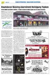 Seite 26 EMSTEKER NACHRICHTEN Raumdecor Büssing übernimmt Reinigung Tapken Service bleibt unverändert erhalten / Frühere Inhaberin Hedwig Tapken mit 96 Jahren verstorben Emstek (bd). Die Übernahme der Reinigung Tapken ist für Georg Büssing von „Raumdecor Büs- sing“ die ideale Ergänzung zum bereits bestehenden Reinigungs- programm. „Nun kann ich die ge- samte Bandbreite aus dem Reini- gungsbereich anbieten: von Service erweitert: Georg Büssing, Inhaber von Raumdecor Büssing, hat die Reinigungsannahme- stelle von Hedwig Tapken übernommen. Polstermöbelreinigung über Bo- Beruf. Es war ihr Leben. Sie ver- denbelagssäuberung bis hin zum richtete ihre Aufgabe auch im ho- Gardinenreinigungsservice und hen Alter von 96 Jahren stets zu- nun noch die Wäsche und Reini- verlässig und reibungslos. Die gung von Textilien aller Art“, er- Kunden kamen gerne zu ihr. Erst läutert er den Schritt zur Über- als ihr die Erledigung der Arbeiten nahme der Annahmestelle. zu schwer fiel, wurde Georg Büs- # sing die Reinigung angeboten. & "# " & %%% % $ ! Neben den schon bestehenden Kurz darauf, Ende August dieses % $ $ $ % ! $ Raumausstattungsdienstleistun- Jahres, verstarb Hedwig Tapken. gen wie Anfertigung und Dekora- „Ich trete ein verantwortungs- tion von Gardinen, Polstern, Son- volles Erbe an“, weiß Büssing im nenschutz, Insektenschutz, Er- Hinblick auf die Stammkund- stellung von komplexen Wohn- schaft. Geändert wird am guten konzepten, Maler- und Tapezier- Service nichts. Die Reinigung ist arbeiten an Wand und Decke , Au- in den hinteren Bereich des La- topolsterei sowie die fachgerechte dengeschäftes der Firma „Raum- Verlegung von Bodenbelägen al- decor Büssing“, in der Bahnhof- ler Art nimmt Firma Büssing nun straße 9, integriert. auch noch die Textilreinigung Geschäftszeiten: Montags bis und Wäsche ins Portfolio auf. freitags von 8 bis 12 Uhr und von Für die ehemalige Reinigungs- 14 bis 18 Uhr sowie samstags von inhaberin Hedwig Tapken war ihr 9.30 bis 13 Uhr. Telefonisch er- Geschäft in Emstek mehr als ein reichbar unter 04473/ 373. De Dörpkraug Im Schulgarten 21 · 49685 Höltinghausen · Tel. 0 44 73 / 25 41 in Halen Familie Harling-Scheper, Halen Neu! Annahmestelle für Neu! Schmuckanfertigung Textilreinigung bei Reparaturen von Raumdecor Büssing Schmuck und Uhren Batteriewechsel Denken Sie rechtzeitig Mo. 8.30 - 14.30 Uhr „Denn gute ...brauchen an Ihre Termin n. Vereinbarung! Weihnachtsfeier. Sachen... liebevolle Wir bitten um Anmeldung. Pflege“ Tel. 0 44 73 / 3 93 www.gaststätte-harling-scheper.de Gutenbergstraße 7 · 49681 Garrel · Tel. 04474 / 405