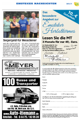 EMSTEKER NACHRICHTEN Seite 31 Das 10,-€ besondere Gutschein Angebot zur Emsteker Herbstkirmes Lesen Sie die MT Siegergeld für Messdiener 3 Monate für nur 49,- Euro. Halen (db). Für eine sehr will- mit einer Thronabordnung kommene Aufbesserung der 160 Euro an Lagerleiter Tors- Als Dankeschön für Ihre Lagerkasse der Halener Mess- ten Grafe. Der Königsthron Bestellung erhalten Sie Nutzen Sie die diener sorgte der letztjährige hatte auf der Sommerkirmes Gelegenheit! Königsthron der St.-Georg- 2013 das Wettsägen des HGV einen 10,- Euro-Warengutschein Schützenbruderschaft Halen Emstek gewonnen. Der Thron von der Gaststätte Feldhaus, Halen. . während des diesjährigen spendete jetzt die Siegprä- Gaststätte Saalbetrieb Zeltlagers in Halenhorst. Kö- mie für die Messdiener. nigin Andrea Grafe übergab Foto:Dobelmann Reinhold Feldhaus Das Abo endet automatisch. Sie gehen keine weiteren Verpflichtungen ein. Das Angebot ist gültig bis 15.11.2014. Ja, ich möchte die MT 3 Monate lang für 49,- Euro lesen. In meinem Haushalt bestand in den letzten 6 Monaten kein Abonnement der MT. Das 3-Monats-Abo endet automatisch. Ich gehe damit keine weiteren Emstek, Lange Straße 29, 04473 - 926 996 Verpfichtungen ein. Als Dankeschön erhalte ich einen Warengutschein Kompetent + Umfassend + Günstig von der Gaststätte Feldhaus, Halen. Name 100 Busse und Vorname Straße/Nr. Transporter PLZ/Ort Telefon E-Mail O MT als Printausgabe O MT als digitales ePaper Ich willige ein, dass die Münsterländische Tageszeitung den Betrag von 49,- Euro von meinem Konto einziehen darf. Konto-Nummer Bankleitzahl z.B. Doka, Pritschen usw. Bank von VW, DB, MAN usw. bis 7,5 t. Datum, Unterschrift www.Auto-Riemann.de Ich gestatte der Münsterländischen Tageszeitung mir telefonisch und/oder per E-Mail Vorteils- angebote zu unterbreiten. Eine Weitergabe Ihrer Daten an Dritte erfolgt nicht. Schicken Sie den Emstek · Tel. 0 44 73 / 92 93 20 ausgefüllten Coupon an die Münsterländische Tageszeitung, Lange Straße 9, 49661 Cloppenburg oder faxen sie ihn an 04471/17830 oder per Mail an vertrieb@mt-news.de.