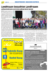 Seite 34 EMSTEKER NACHRICHTEN Landfrauen besuchten Landfrauen Landfrauen Emstek waren zu Gast bei den Landfrauen Balve im Sauerland Emstek(mv). Mit einem Sekt wur- den die Landfrauen Emstek von den Landfrauen Balve auf dem Jungferngut Garbeck begrüßt. Die Gastgeberinnen hatten ein unter- haltsames Programm vorbereitet. Nach einer herzhaften westfäli- schen Kartoffelsuppe ging es zur Balver Höhle. In der größten offenen Kultur- höhle in Europa können ca. 2000 Menschen feiern oder bei Konzer- ten die einzigartige Akustik und Atmosphäre erleben. Die Land- frauen erfuhren hier, welche Be- deutung die Schützenvereine im Sauerland haben. Viele Gemein- den im Sauerland sind stolz auf ihre riesigen Schützenhallen mit den repräsentativen Festsälen. Die Balver Schützenbruderschaft St. Sebastian, die Eigentümerin der Höhle ist, feiert seit über 150 Die Emster Landfrauen mit ihren Gastgeberinnen vor der Balver Höhle Foto: Landfrauen Emstek Jahren ihr Fest in „ihrem Felsen- dom“. An drei Festtagen beleben gen viele Ehemalige in ihre Hei- erfuhren die Landfrauen dann in berg-Velen geladen, deren Schloss Tausende trinkfeste Gäste von mat zurück. der Luisenhütte, einem Museum auch besichtigt wurde. nah und fern die Höhle und ihren Welche wirtschaftliche Bedeu- mit der ältesten, vollständig er- Am zweiten Besuchstag stand Vorplatz. Ähnlich wie beim Stop- tung die Eisenerzvorkommen des haltenen Einrichtung einer Hoch- die Besichtigung der Burg Altena pelmarkt kommen an diesen Ta- nordöstlichen Sauerlandes hatte, ofenanlage in Deutschland. und eine Fahrt durch das Hoch- Daran anschließend hatten die sauerland auf dem Programm. gastgebenden Landfrauen zum Mit dem Kaffeetrinken auf der Kuchenbuffet in die VIP-Lounge „Almhütte Wildewiese“ endete der Reitanlage Wocklum auf dem bei traumhaftem Wetter das Gelände der Familie von Lands- schöne Wochenende. Erdgas- und Flüssiggastankstelle . . LOTTO EC-Automat Backshop Knoop & Söhne GmbH & Co. KG 24h Tankautomat K1 Tankstelle Knoop Heinrich-Beckermann-Str. 4 Otto-Hahn-Straße 5 49692 Cappeln 49685 Emstek Tel.: 04473 - 94 70 25 . Fax: 04473 - 94 70 27 AUTOVERMIETUNG