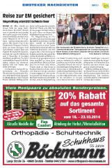 EMSTEKER NACHRICHTEN Seite 5 Reise zur EM gesichert Bürgerstiftung unterstützt Nachwuchs-Boxer Emstek (sl) Allen Grund zur Suche nach Sponsoren gemacht, Freude hatte der junge Nach- damit der Traum vom EM-Titel wuchs-Boxer Alexander Wersch für den jungen Nachwuchssport- vom SV Emstek, als er sich im Mai ler nicht schon vor Beginn des dieses Jahres gegen seine Konkur- Wettkampfs ausgeträumt ist. renten durchsetzte und den Deut- Die Bürgerstiftung der Ge- schen Meistertitel der U-17 ge- meinde Emstek möchte das junge wann – und das mit gerade mal 15 Sporttalent unterstützen und hat Jahren. Mit diesem Sieg in der daher sowohl an Alexander Klasse bis 66 Kilogramm holte er Wersch als auch an seinen Trainer nicht nur einen wichtigen Titel jeweils einen Scheck in Höhe von Der Vorsitzende der Bürgerstiftung, Bernhard Twenhövel (4.v.l.), nach Emstek, sondern hatte sich 1.000 Euro überreicht. „Die Stif- überreichte bei einer Trainingsstunde der Emsteker Nachwuchs- zugleich für die Box-Europameis- tung hat sich in ihrer Satzung zur Boxer Schecks an den Boxer Alexander Wersch (Mitte) und dessen terschaft, die vom 30. Oktober bis Aufgabe gemacht, die Jugend der Trainer Wilhelm Höfling (2.v.r.) Foto: Reiner kl. Holthaus zum 9. November in Russland Gemeinde Emstek zu fördern, in- stattfindet, qualifiziert. Die nicht dem sie z.B. jungen Sporttalenten mit dieser Unterstützung auch nanziell bewältigen müssten“, unerheblichen Kosten für die Teil- dabei behilflich ist, ihren Sport positive Vorbilder für andere Ju- stellte der Vorsitzende der Bürger- nahme müssen der talentierte auch auf höherer Ebene zu betrei- gendliche hervorheben möchte. stiftung klar und wünschte dem Sportler und sein Trainer aber ben. Da ein Boxer ohne seinen „Alexander Wersch hat mit sei- Sportler und auch seinem enga- selbst aufbringen. Trainer nicht zu dem Event in nem bisherigen Erfolg bereits be- gierten Trainer viel Erfolg. Die Familie ist eine große Un- Russland anreisen kann, wurde wiesen, dass er Talent hat und es Wilhelm Höfling und Alexan- terstützung für Alexander sein Betreuer mit der gleichen verdient hat, gefördert zu werden. der Wersch freuten sich sehr über Wersch, aber die anfallenden Kos- Summe ausgestattet“, betonte der Ein Schüler und seine Eltern wä- die Unterstützung von Seiten der ten überschreiten ihre finanziel- Vorsitzende der Bürgerstiftung, ren aber völlig überfordert, wenn Bürgerstiftung und möchten len Möglichkeiten. Daher hat sich Bernhard Twenhövel, und machte sie die Teilnahme an europäi- auch allen anderen Unterstützern Trainer Wilhelm Höfling auf die deutlich, dass die Bürgerstiftung schen Meisterschaften allein fi- und Spendern danken. Viele Restpaare zu absoluten Sonderpreisen. 20% Rabatt * auf das gesamte Sortiment Kirmes Sonntag von 13 - 18 Uhr für vom 16. - 23.10.2014 * außer ecco und Joya Sie geöffnet! Aktuelle Modelle der Abteilung der Herbst-/Winterkollektion Orthopädie - Schuhtechnik 55 Jahre Lange Straße 36 · 49685 Emstek · Telefon 04473/507 · www.orthopaedie-boeckmann.de