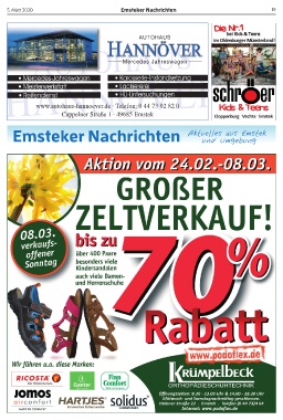5. März 2020 Emsteker Nachrichten 19 AUTOHAUS Mercedes Jahreswagen www.autohaus-hannoever.de · Telefon: 0 44 73 92 82 0 Cappelner Straße 1 · 49685 Emstek ∙ ∙ Emsteker Nachrichten Aktuelles aus Emstek und Umgebung