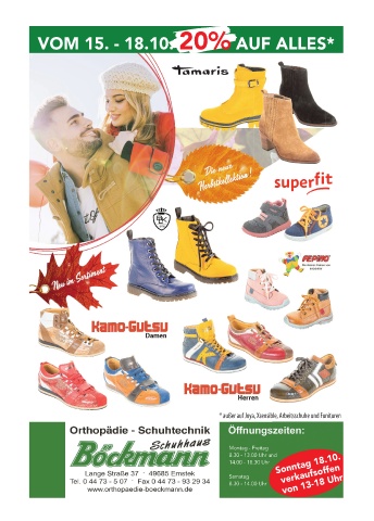 VOM 15. - 18.10. 20% AUF ALLES* * außer auf Joya, Xsensible, Arbeitsschuhe und Funituren Montag - Freitag Sonntag 18.10. 8.30 - 13.00 Uhr und 14.00 - 18.30 Uhr Samstag verkaufsoffen 8.30 - 14.00 Uhr von 13-18 Uhr
